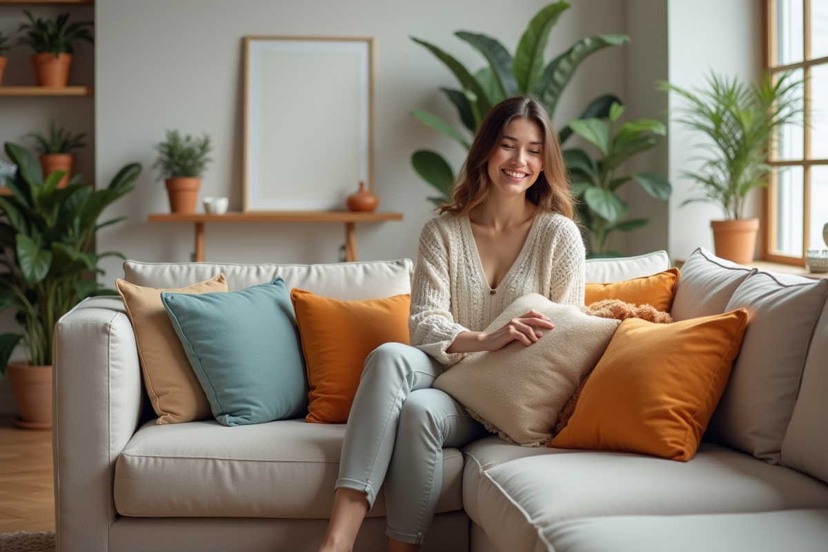 Le choix du mobilier entre alors en résonance avec l’ensemble : quelques coussins ocre, un tapis brun profond, et la pièce gagne en vitalité comme en structure.